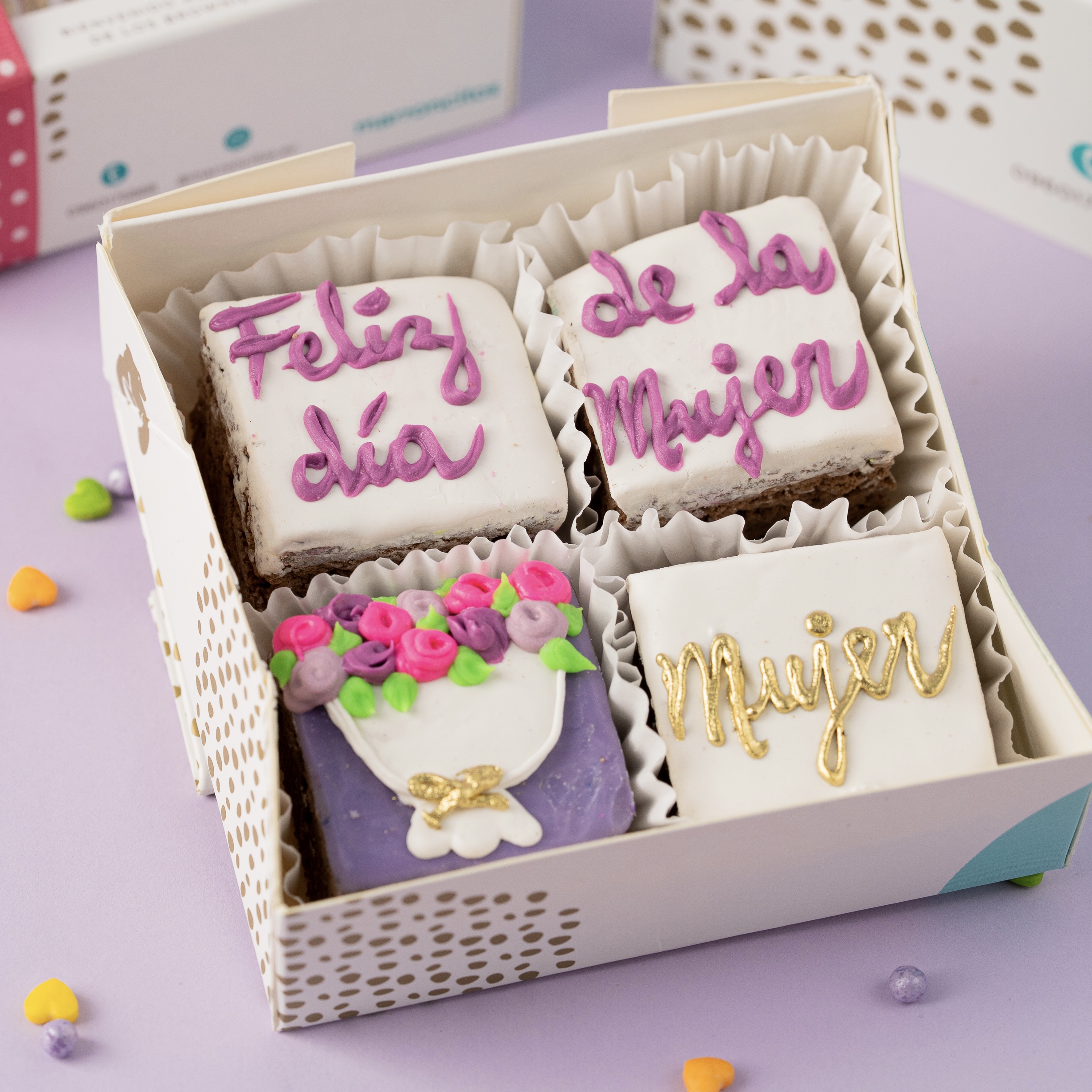 Caja de 4 mini brownies decorados con chocolate con temática del Día de la Mujer