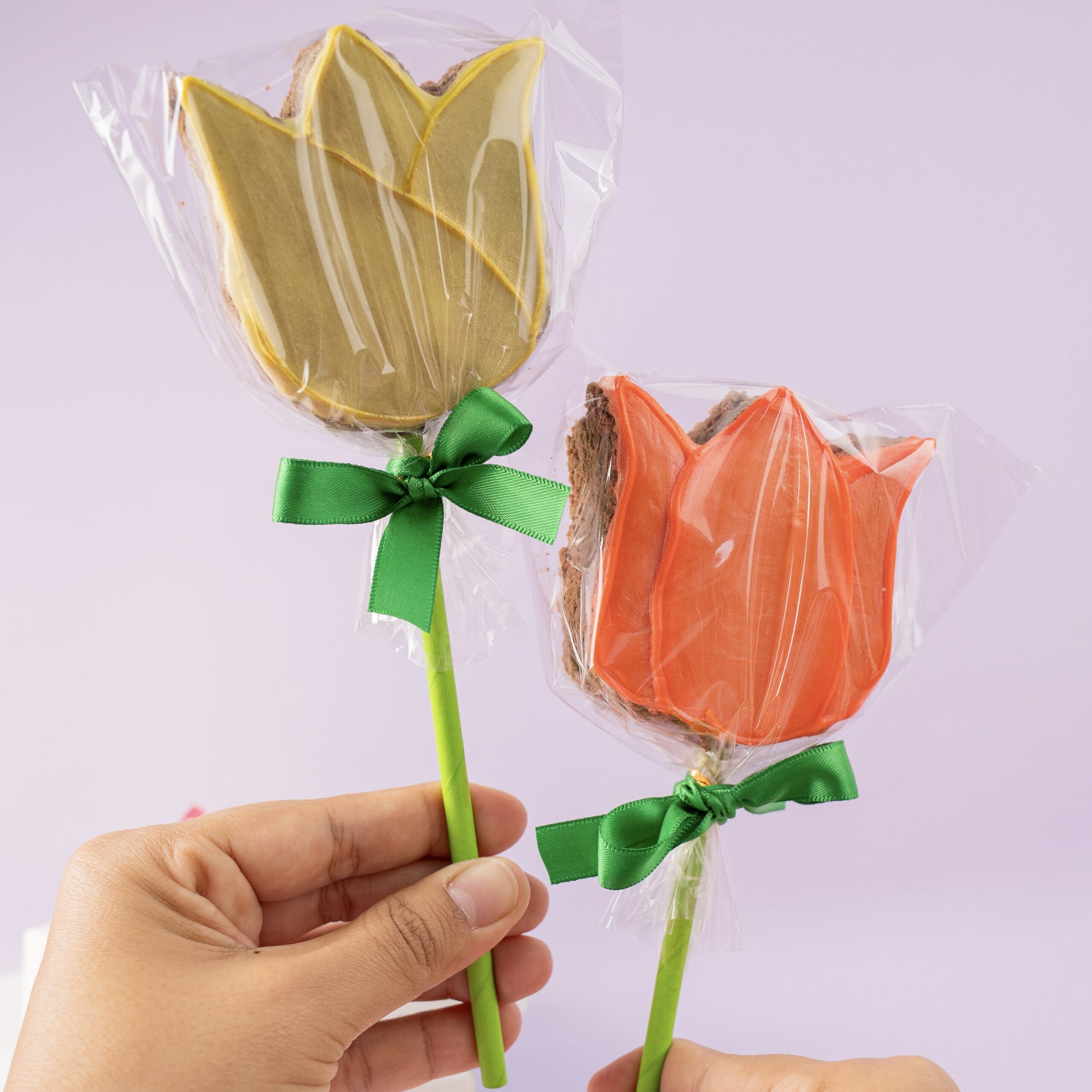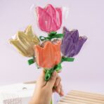 Paleta de brownie en forma de tulipan decorada con chocolate
