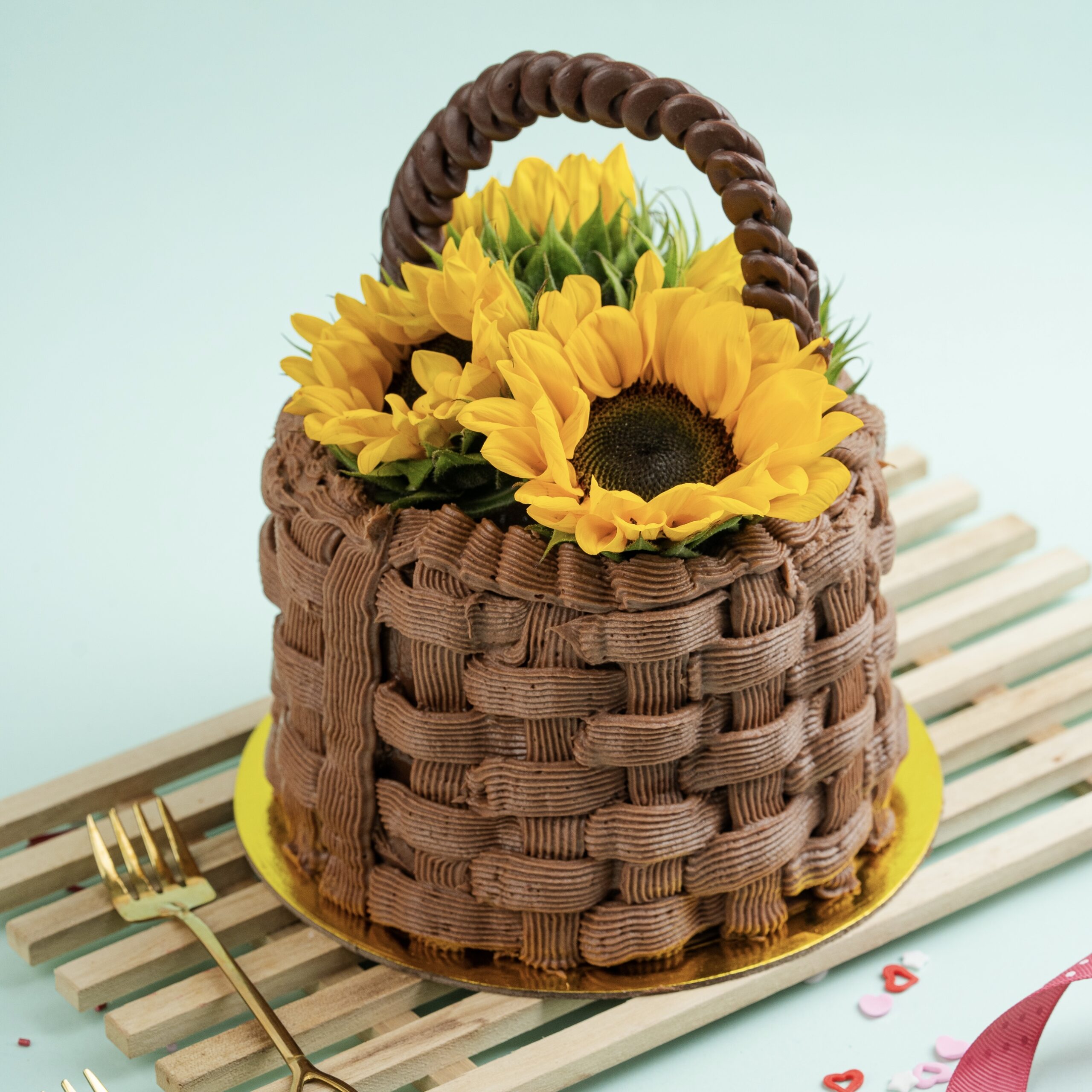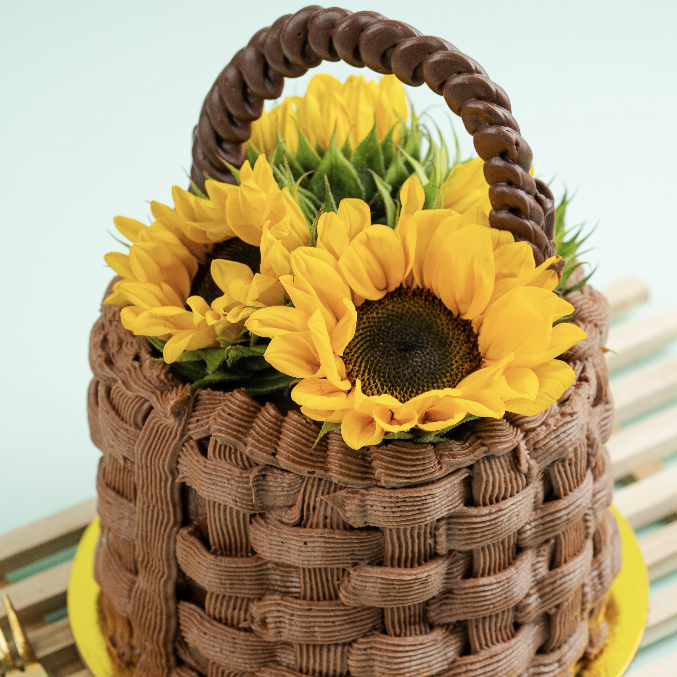 Torta mediana con masa de brownie y decorada con ganache y girasoles.