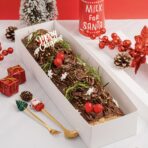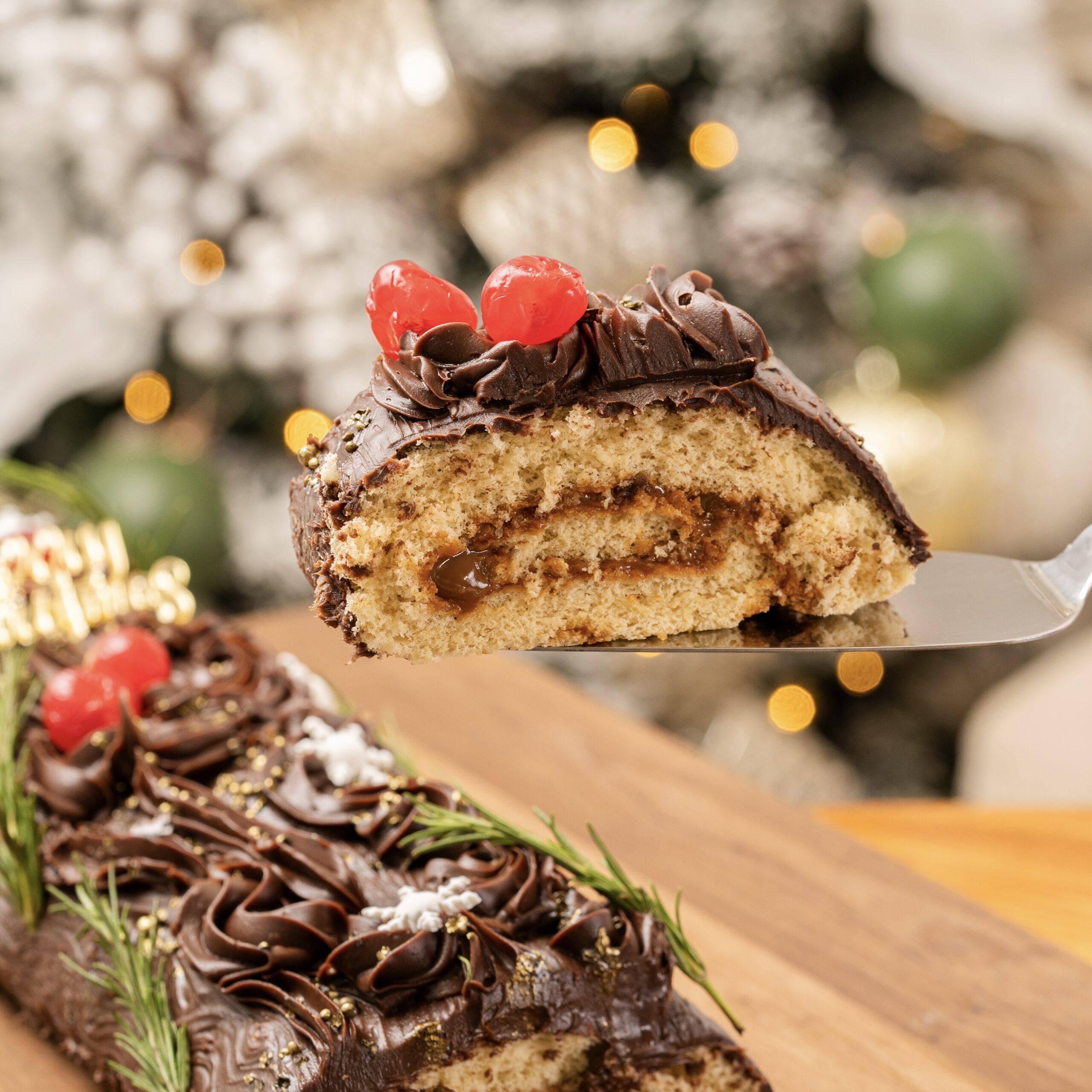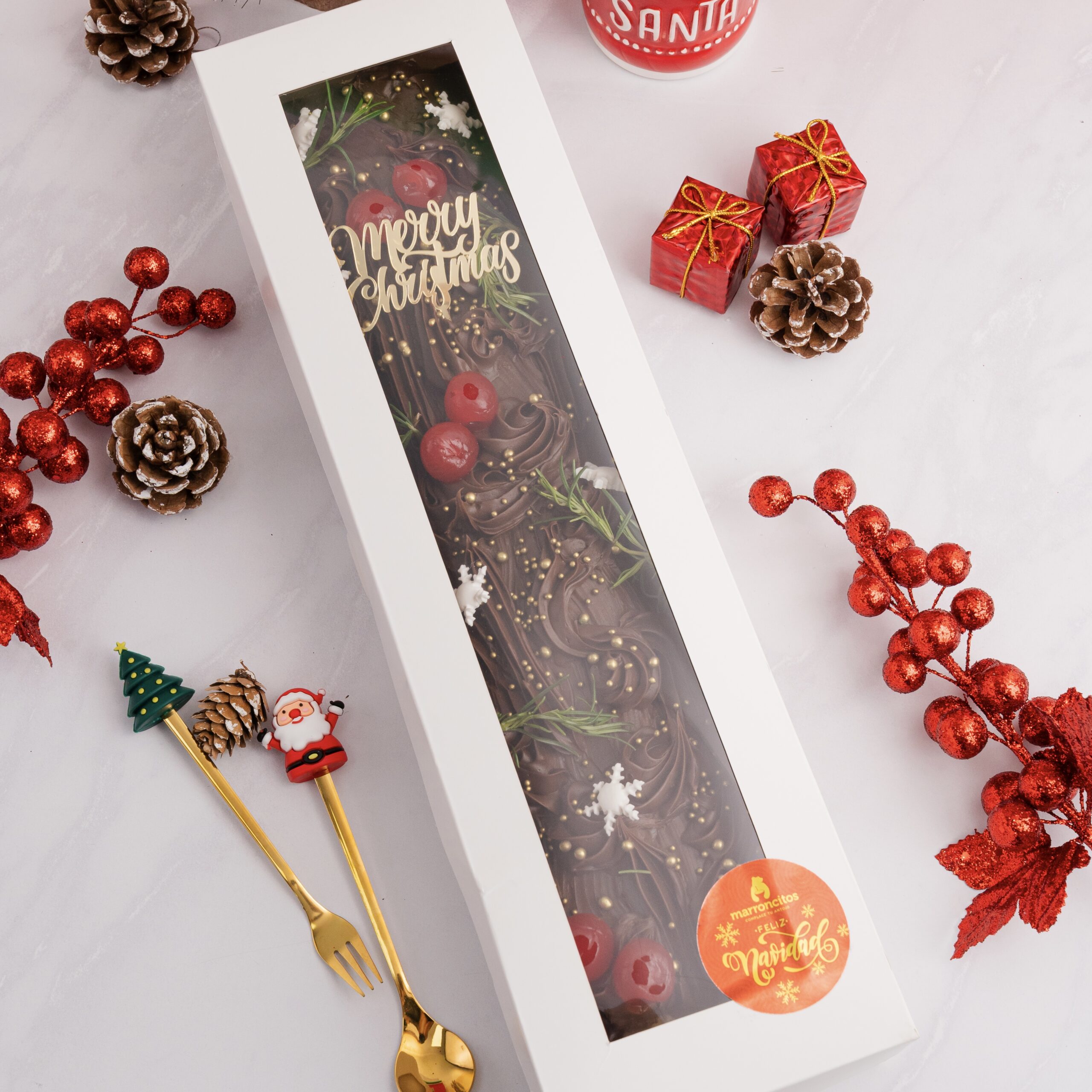 Brazo gitano de bizcocho relleno de manjar, cubierto con ganache de chocolate, decorado con cerezas y topper de Merry Christmas.