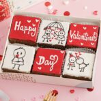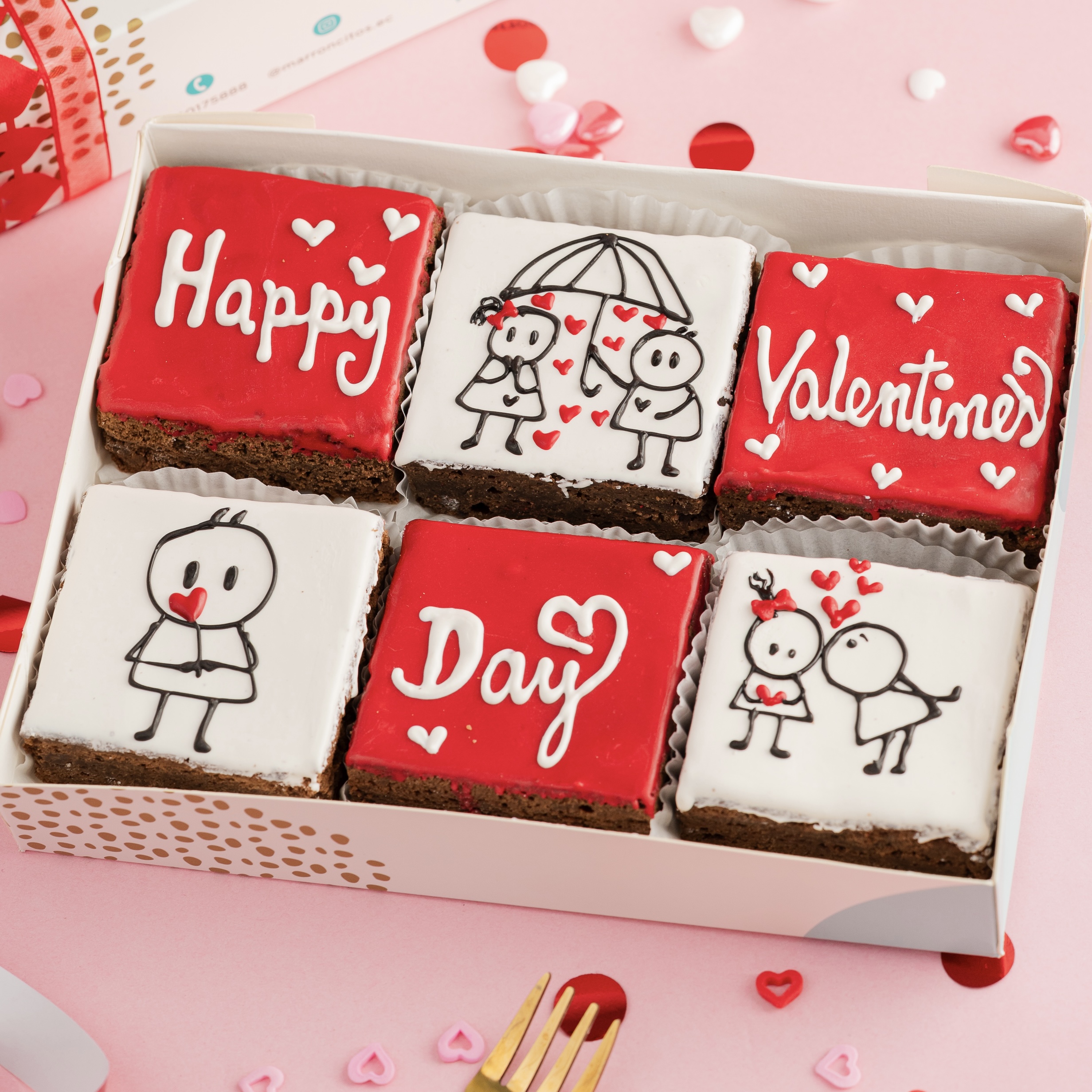 Caja de 6 brownies medianos personalizados de San Valentín, decorados con chocolate.